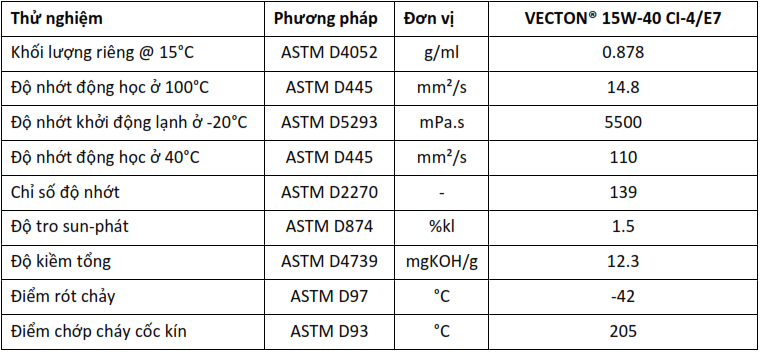 VECTON® 15W-40 CI-4/E7 phù hợp để sử dụng cho động cơ không có gắn bộ lọc cặn dạng hạt (DPF), và cho hầu hết các động cơ có gắn bộ hồi lưu khí xả (EGR) và bộ xúc tác khí thải chọn lọc SCR NOx đáp ứng các tiêu chuẩn khí thải Euro I, Euro II, Euro III, Euro IV và Euro V hoạt động trong các điều kiện khắc nghiệt.